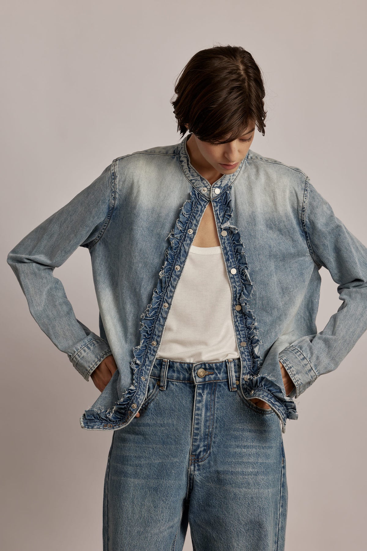 חולצת יוקה עשויה דנים עם עיטורי פרימה לאורך הפתח הקדמי והשרוולים. משחק בין קשיחות הדנים לעדינות הדיטיילז