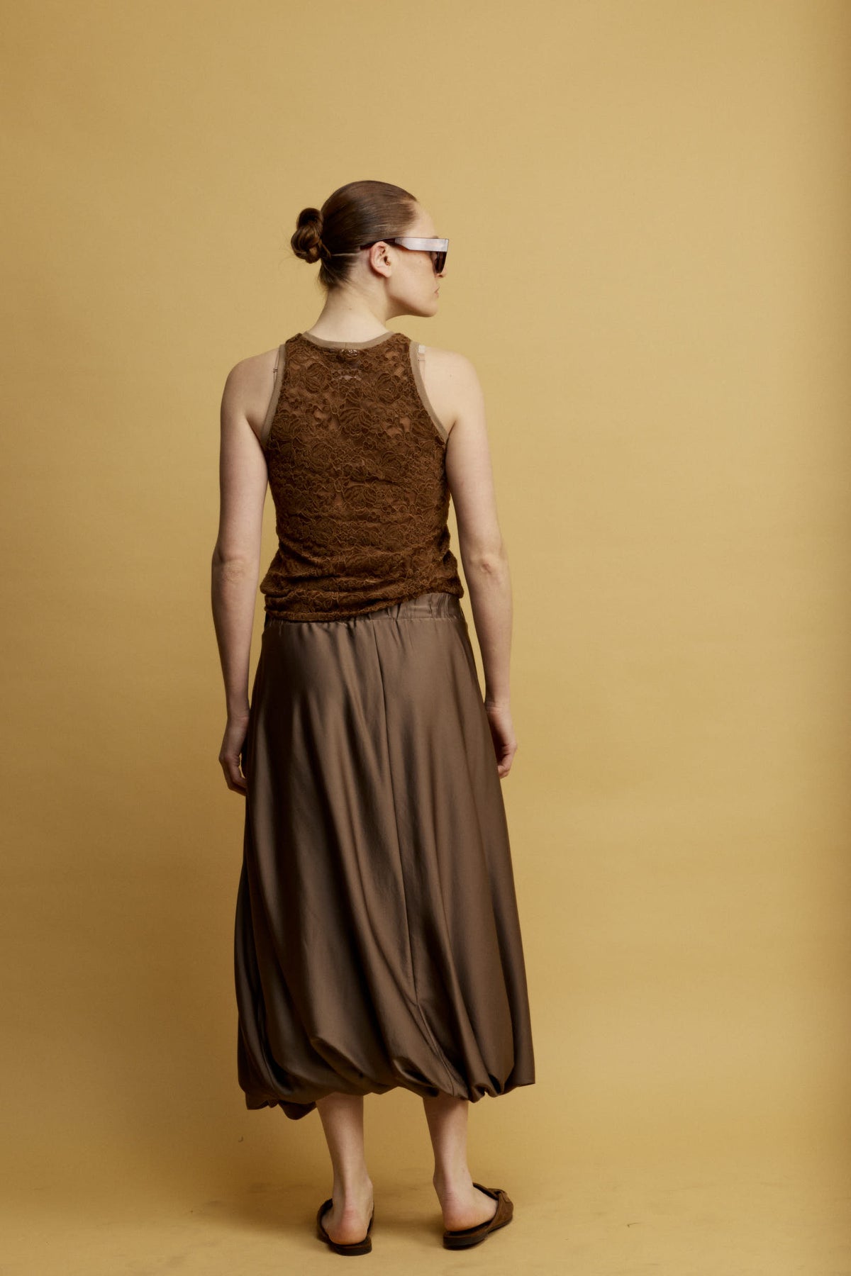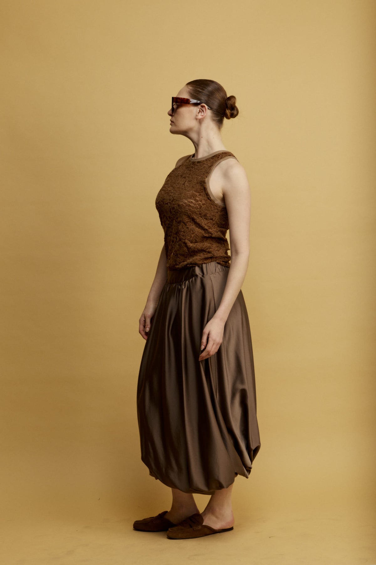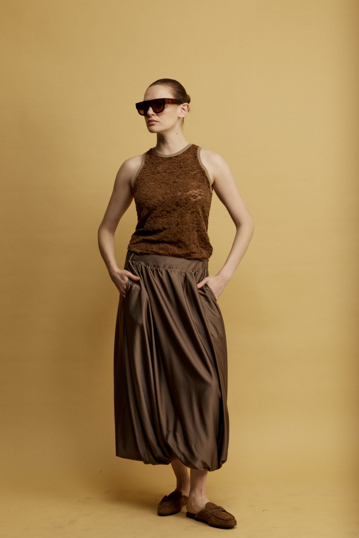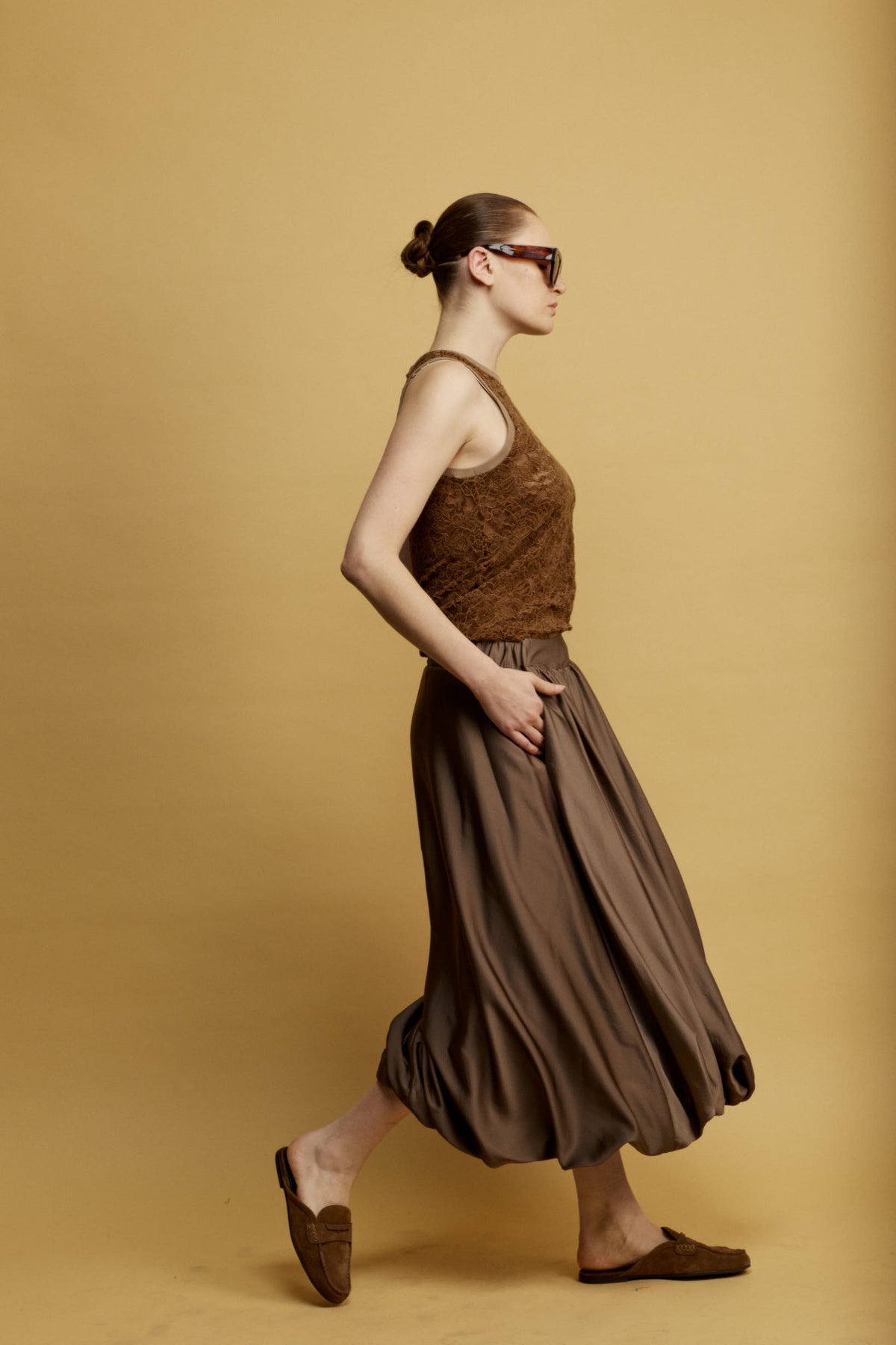 The Alexis Skirt is a midi length skirt with a soft volume structure and define movement. A clean waistband with an inner elastic that gives comfort, side pockets that are seamless, gives fonctionalty. The deep front pleats creates a gathered refined look, and the subtle sheen of the fabric adds depth and presence. Holds its shape while remaining fluid in motion. Style with a fitted top for a balanced look or a softer blouse for a relaxed feel