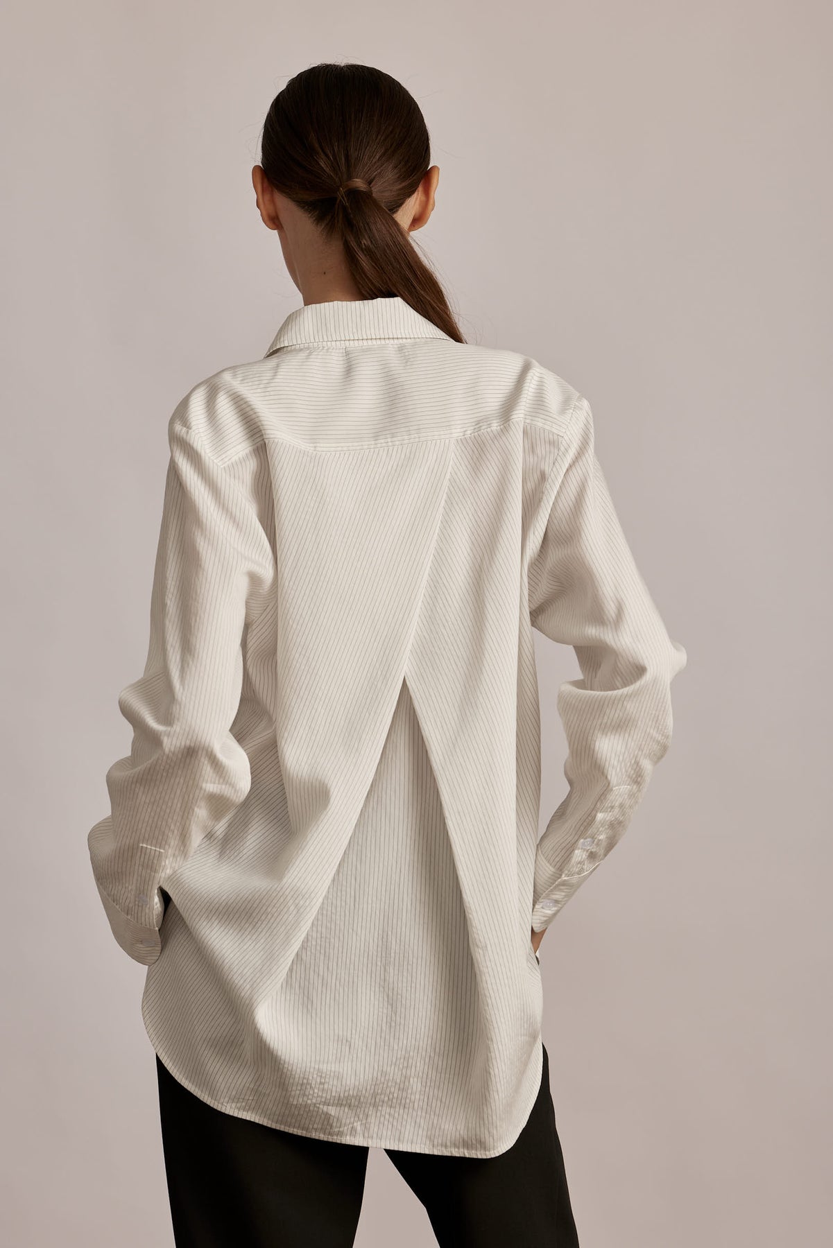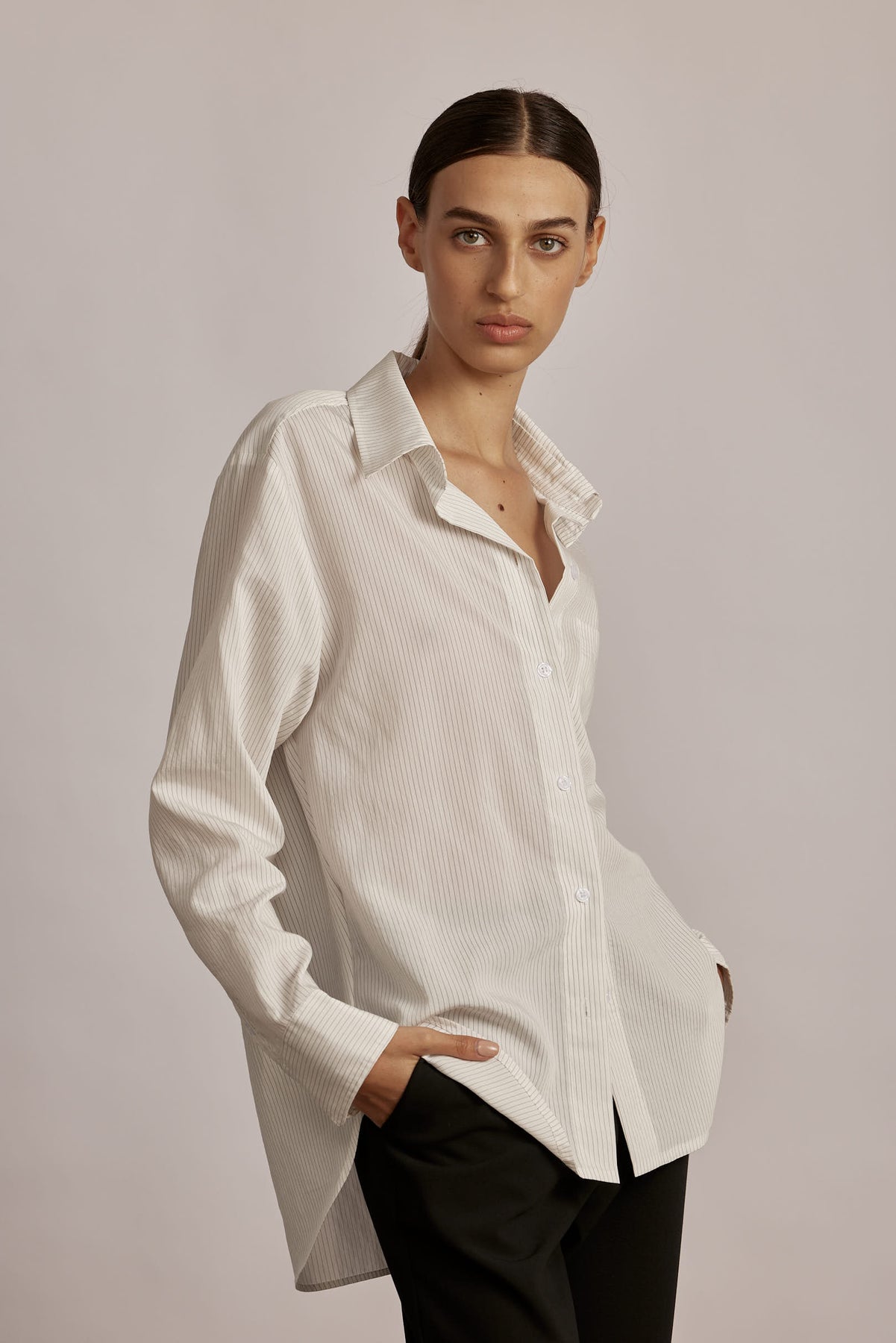 חולצה קלסית בגזרת אוברסייז עם כיס קדמי ושרוולים ארוכים. הבד הדק והנעים עם פסי טקסטורה עדינים יוצר מראה נקי ומודרני, שמתאים גם לשילוב יומיומי וגם ללוק מחויט יותר.