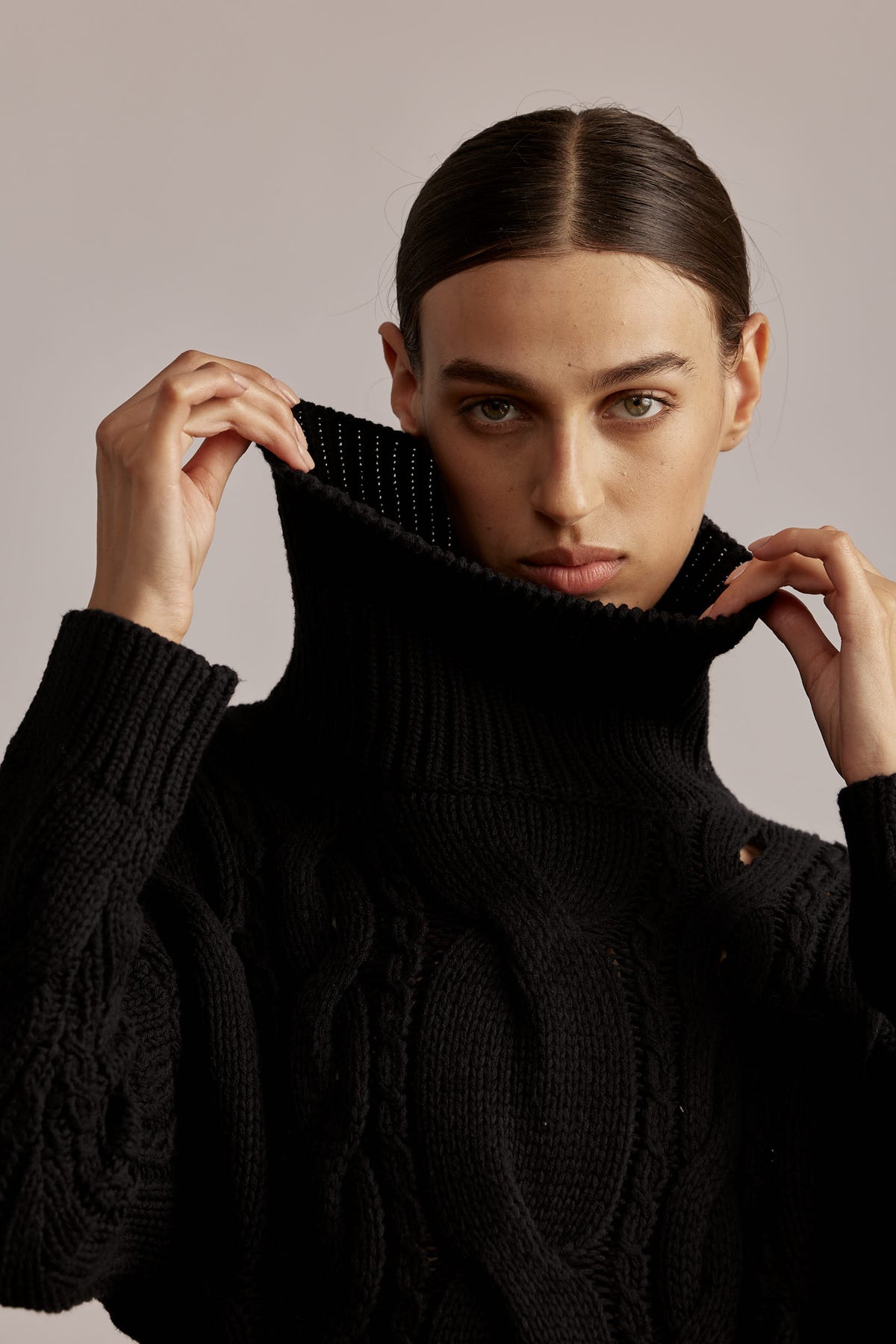 The Ornella Sweater features chunky cable-knit with a relaxed silhouette and a wide turtleneck. Cozy and soft, it balances polished elegance with laid-back comfort – perfect with both an elegant skirt or casual jeans