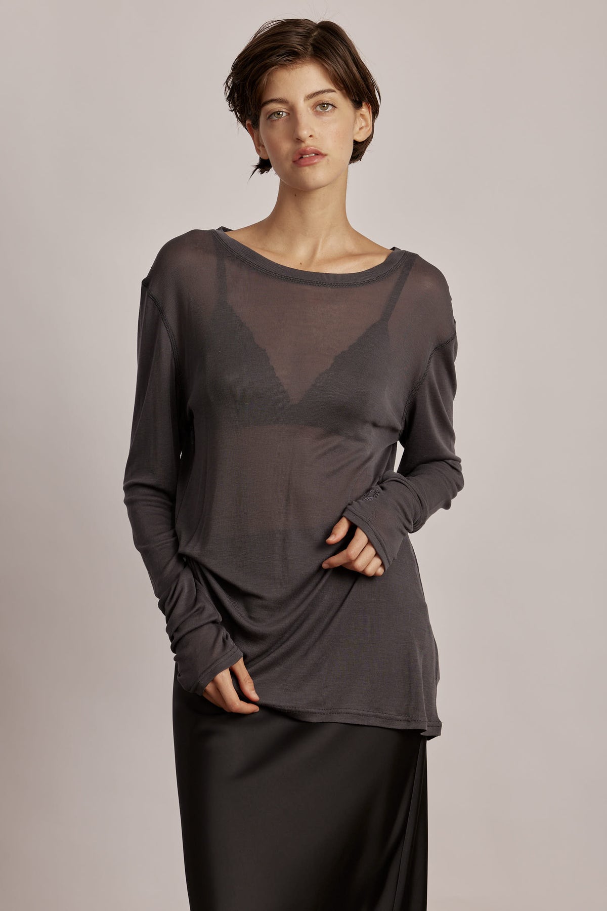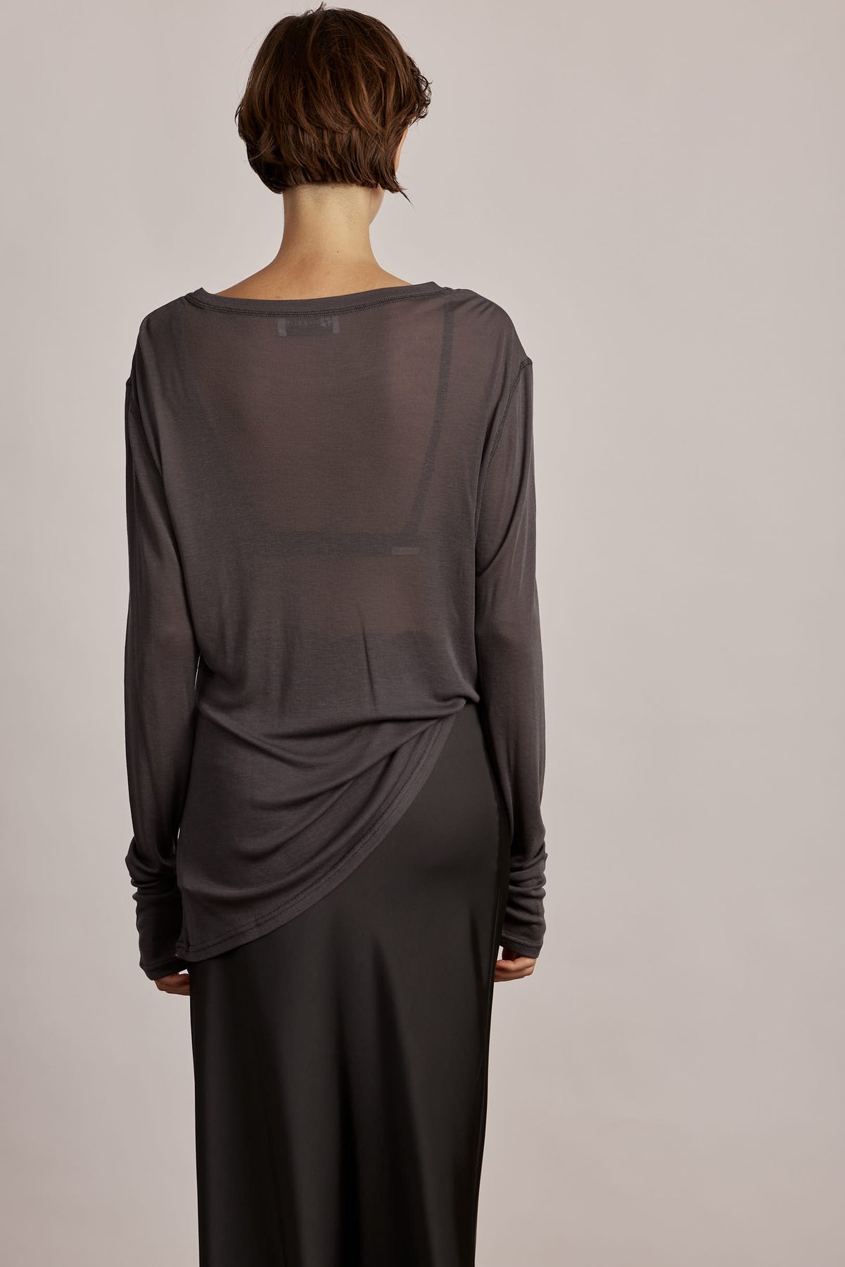 Snow top, crafted from fine microfiber knit, lightweight and breathable, with a subtle sheer finish that makes it ideal for layering. A straight, relaxed fit creates a must-have wardrobe staple, versatile for both casual days and elegant evenings