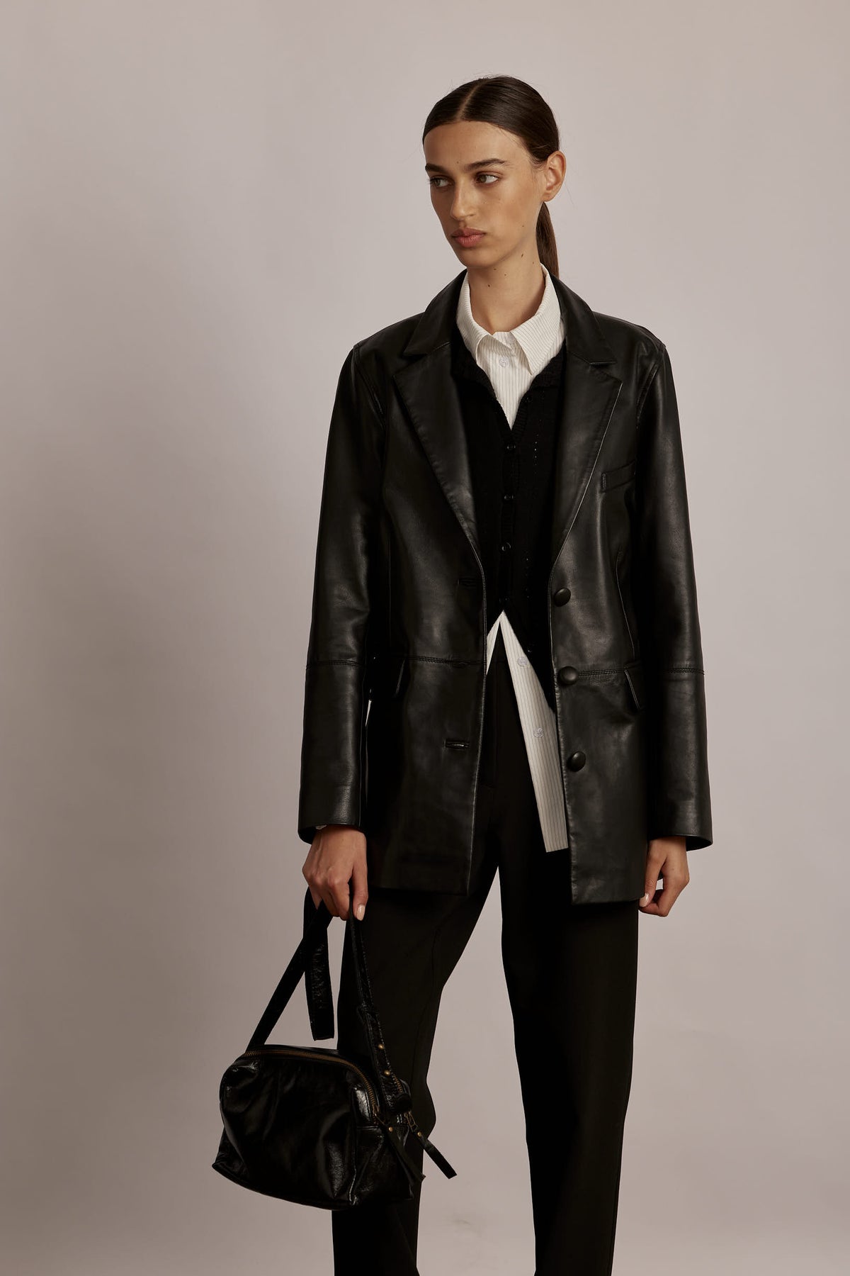 גקט לורנה מעור איכותי בגזרת בלייזר, שני כיסים קדמיים ושליץ באמצע גב, פריט  לאספניות שאוהבות פריטים יחודיים.ממליצות לשלב מעל כל החליפות ללוק אורבני על זמני