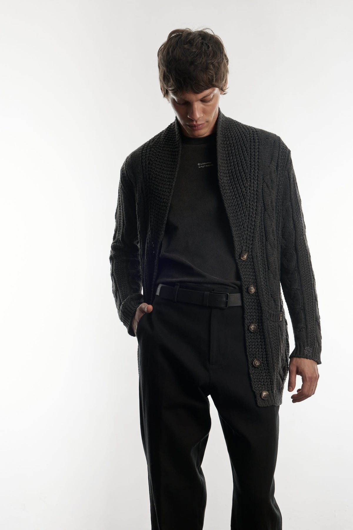 Frederic Cardigan is a chunky cable-knit cardigan that feels soft and cozy, with a strong, stylish presence. Works perfectly layered or on its own. elevating any look with a cozy and modern touch.