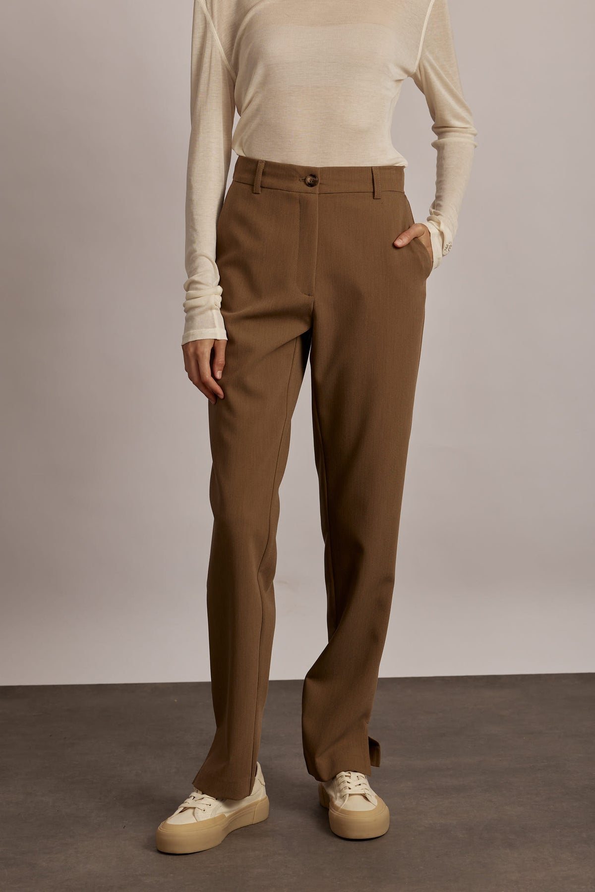 מכנסי סיירה בגזרה ישרה ומחויטת עם מותן גבוהה וסיומת נקייה. הבד הרך והנשפך מעניק נוחות מבלי לוותר על אלגנטיות, ומתאים הן ליום יום והן למראה ערב מתוחכם