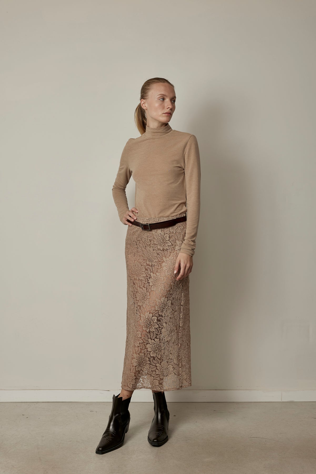 The Eden skirt — this time in lace — is a midi skirt, featuring a delicate floral pattern that adds texture and romance to any look. Its straight, classic lines make it a timeless piece that returns every season, thanks to the perfect balance between elegance and femininity. Suitable for year-round styling – with knits, tanks, or coats – it always delivers an elegant and romantic look.