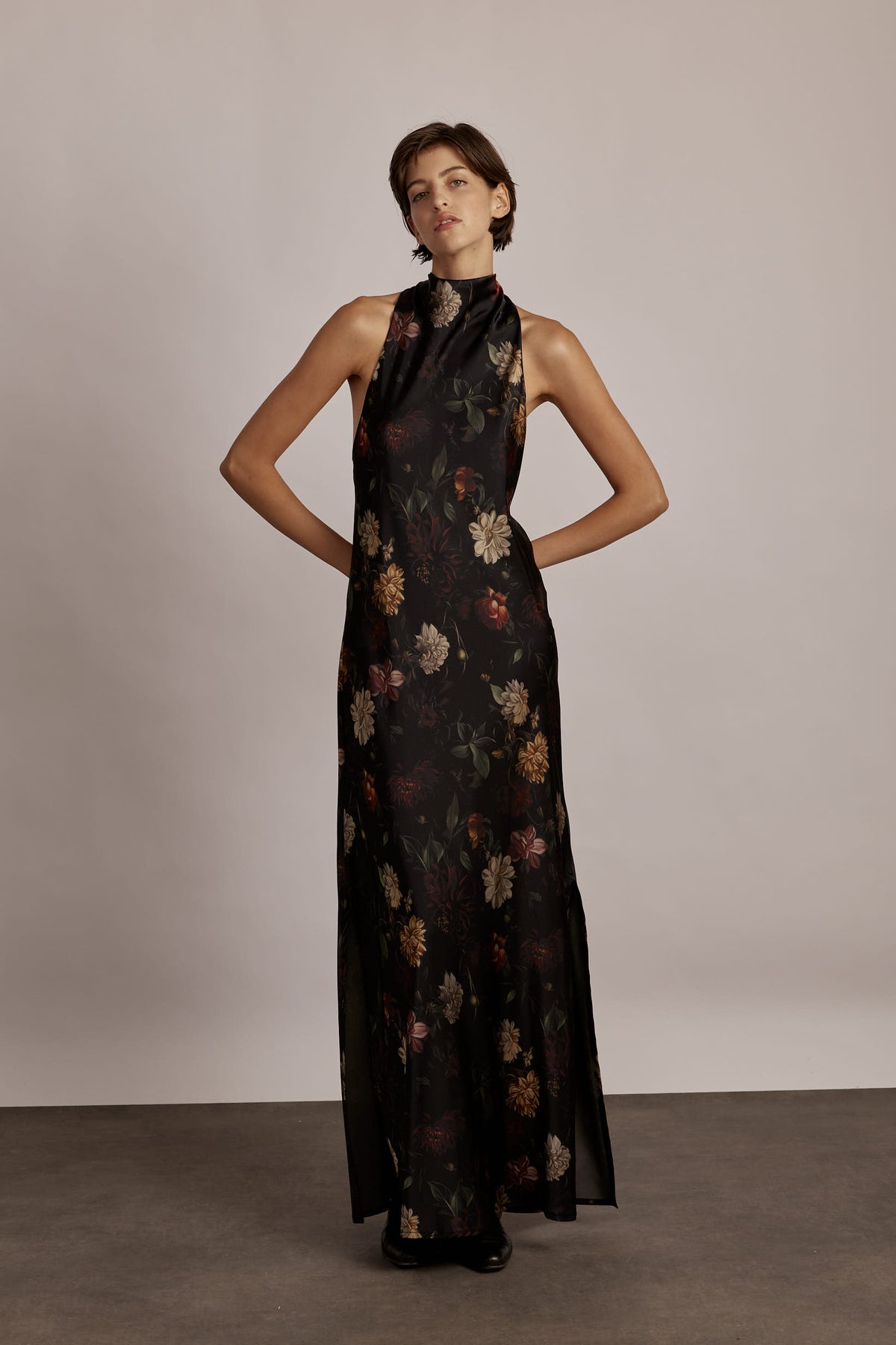 The Monica Dress is a midi-length design with a relaxed fit and high neckline. Side slits add movement and modern ease