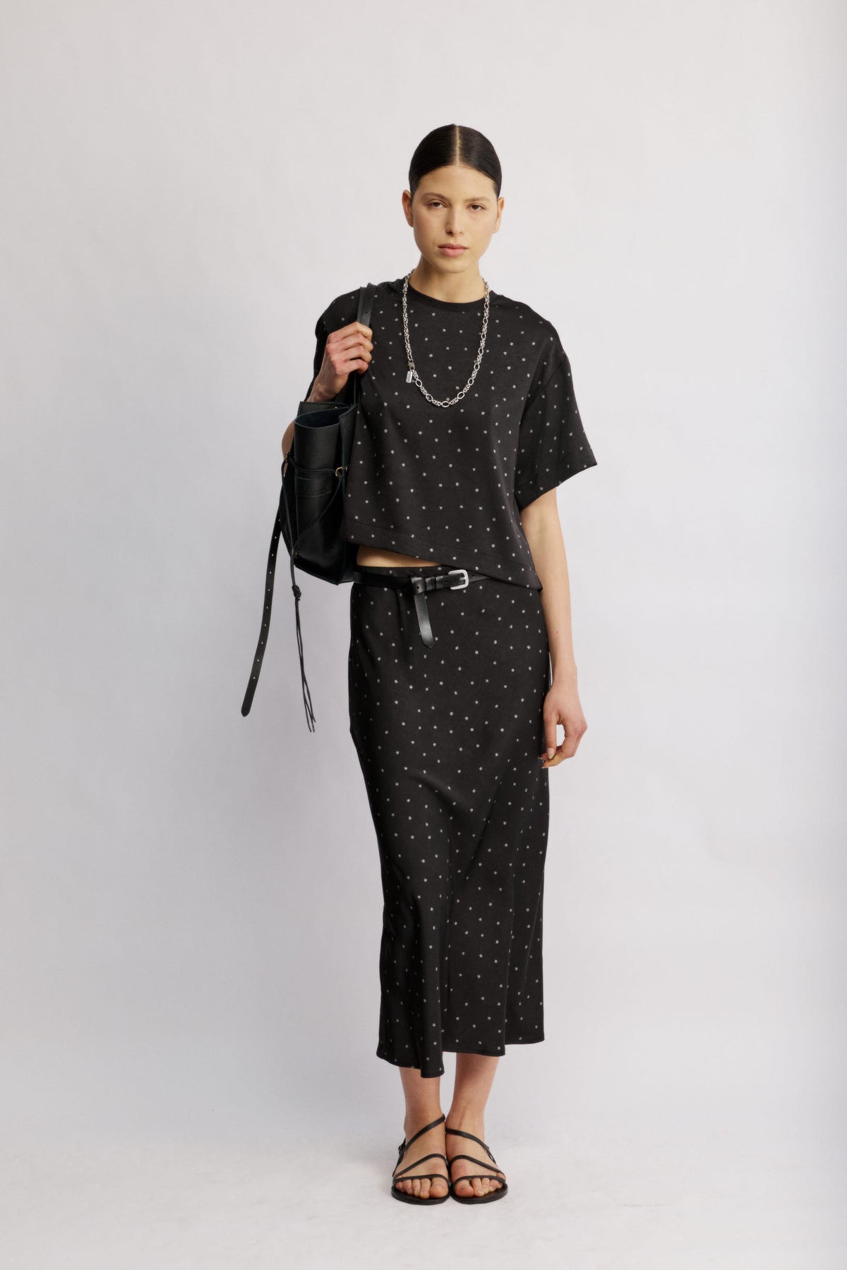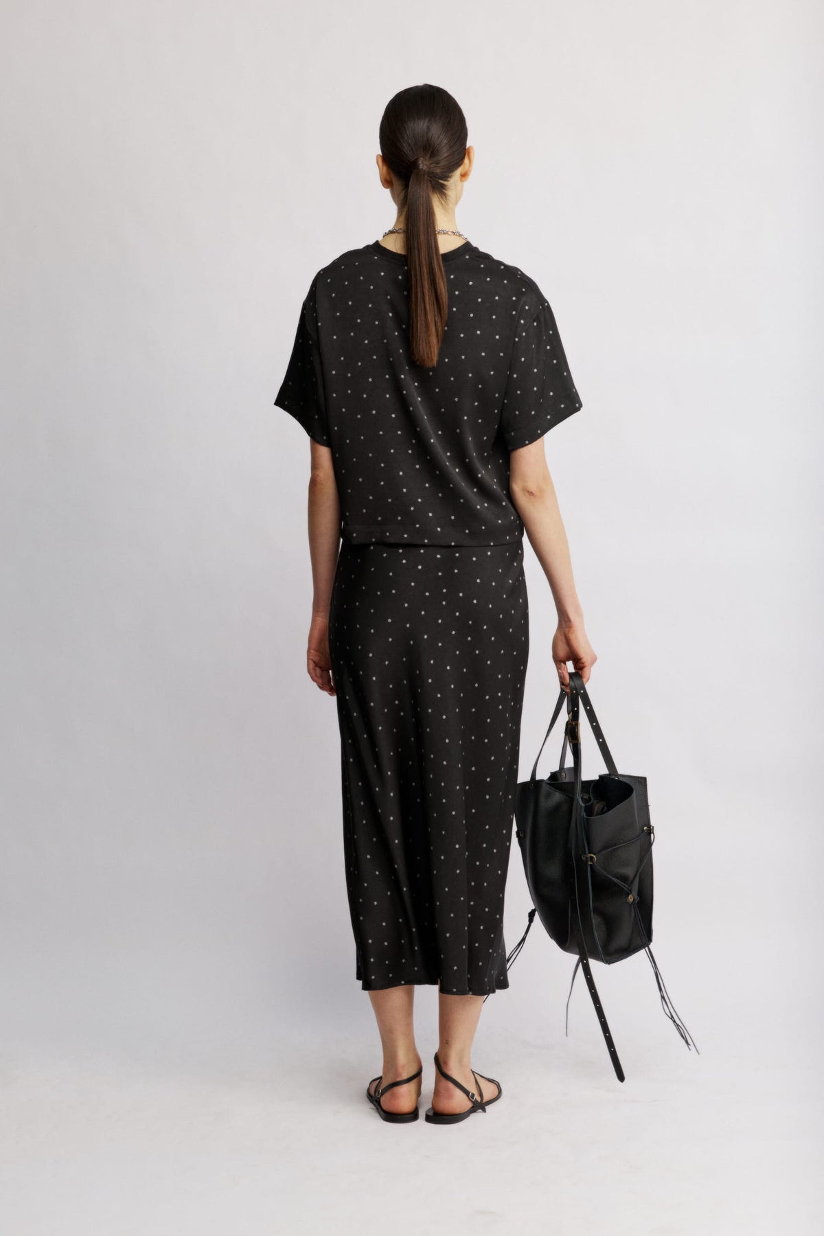 The Eden skirt is a midi skirt with a straight silhouette and a clean waistline that sits comfortably on the body. The dotted pattern gives it a timeless feel that elevates every look. A chic addition to your wardrobe that goes beautifully with a simple tee, a button-down, or an elegant top.