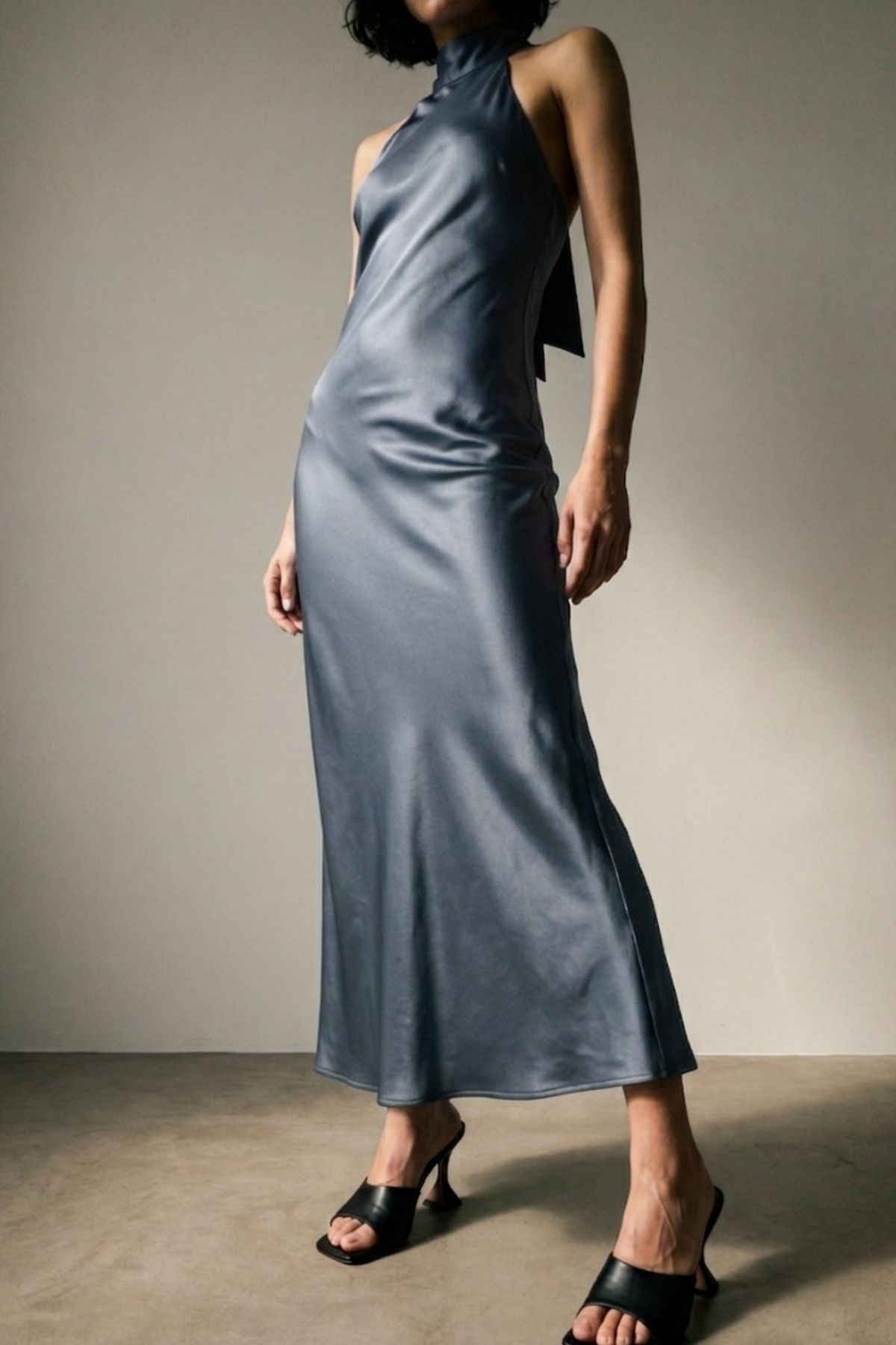 שמלת מוניקה, בגזרה רפויה עם צווארון גבוה ונפילה רכה. פתחי צד עדינים מעניקים תנועה וקלילות מודרנית