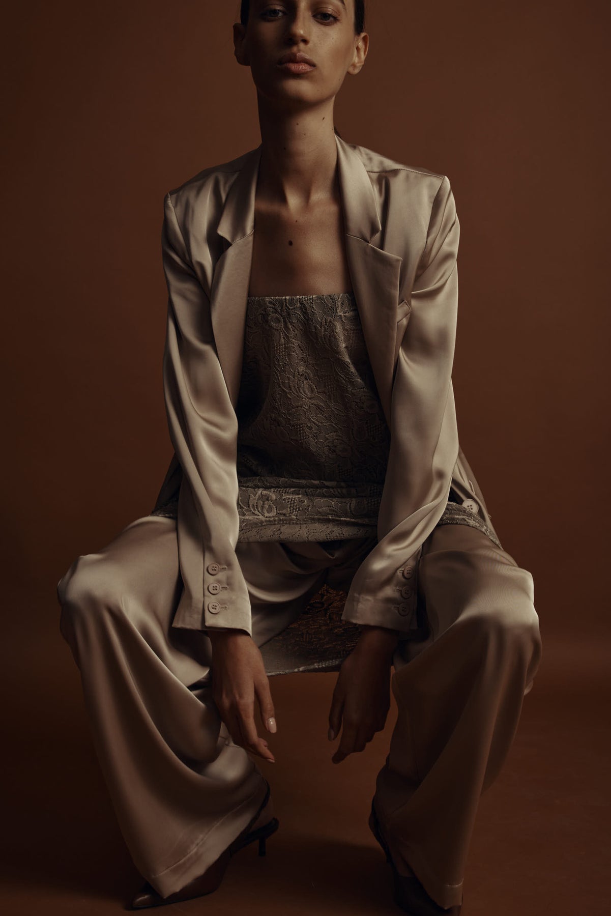 ג׳קט פולי בגזרה מחויטת עם סגירה כפולה בקדמת החזה ושתי שורות כפתורים דקורטיביות. עשוי מאריג חלק ונופל, שמשלב בין קלאסיות מחודדת לנינוחות מודרנית – פריט על־זמני לארון שלך
