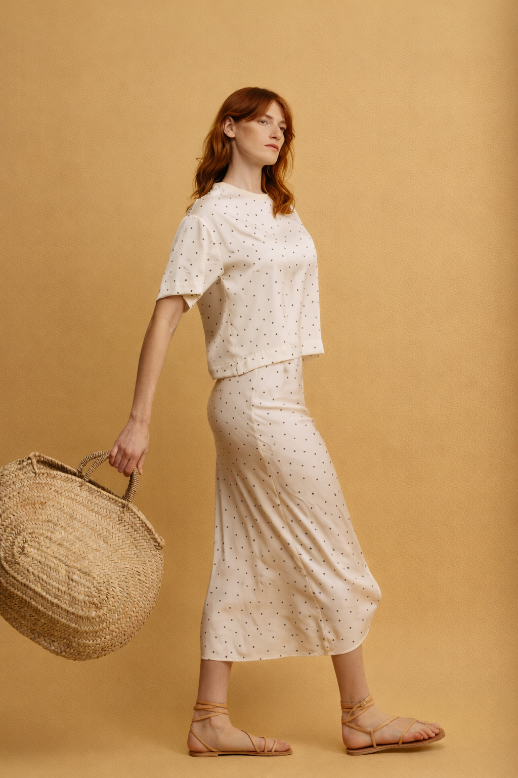 The Duni shirt features a crop fit with short sleeves and a classic round neckline. The lightweight fabric feels soft on the body, while the subtle dotted pattern gives it a refined, chic edge. A timeless basic with a twist that pairs effortlessly with denim, skirts, or tailored trousers.