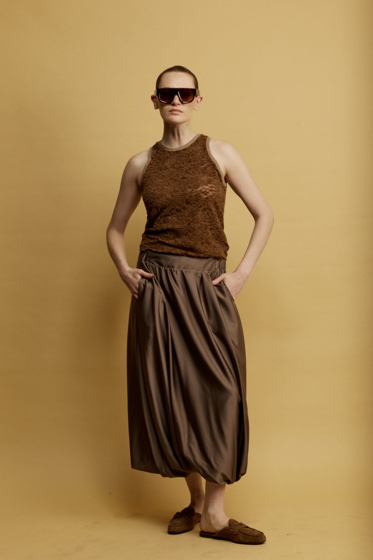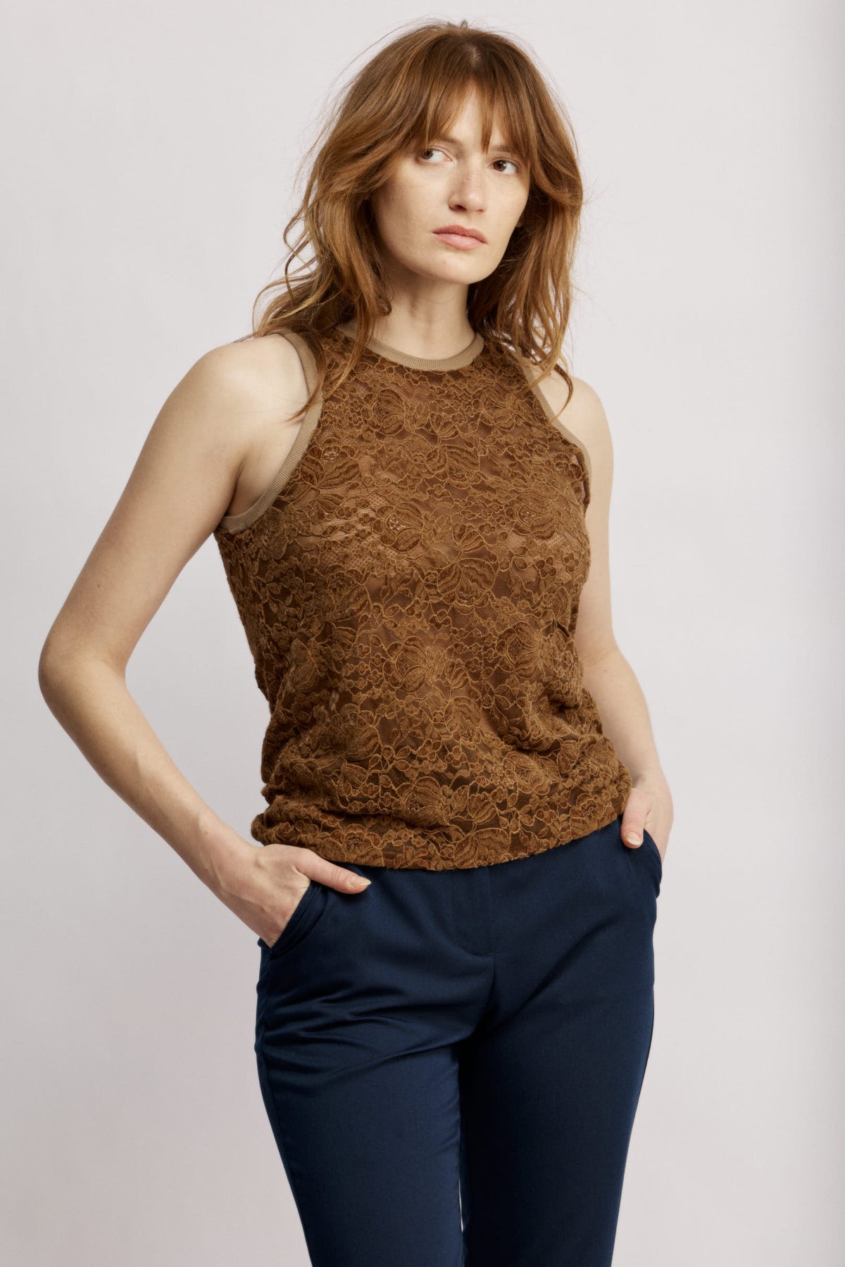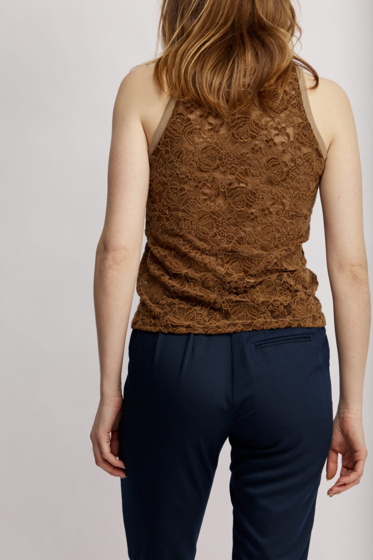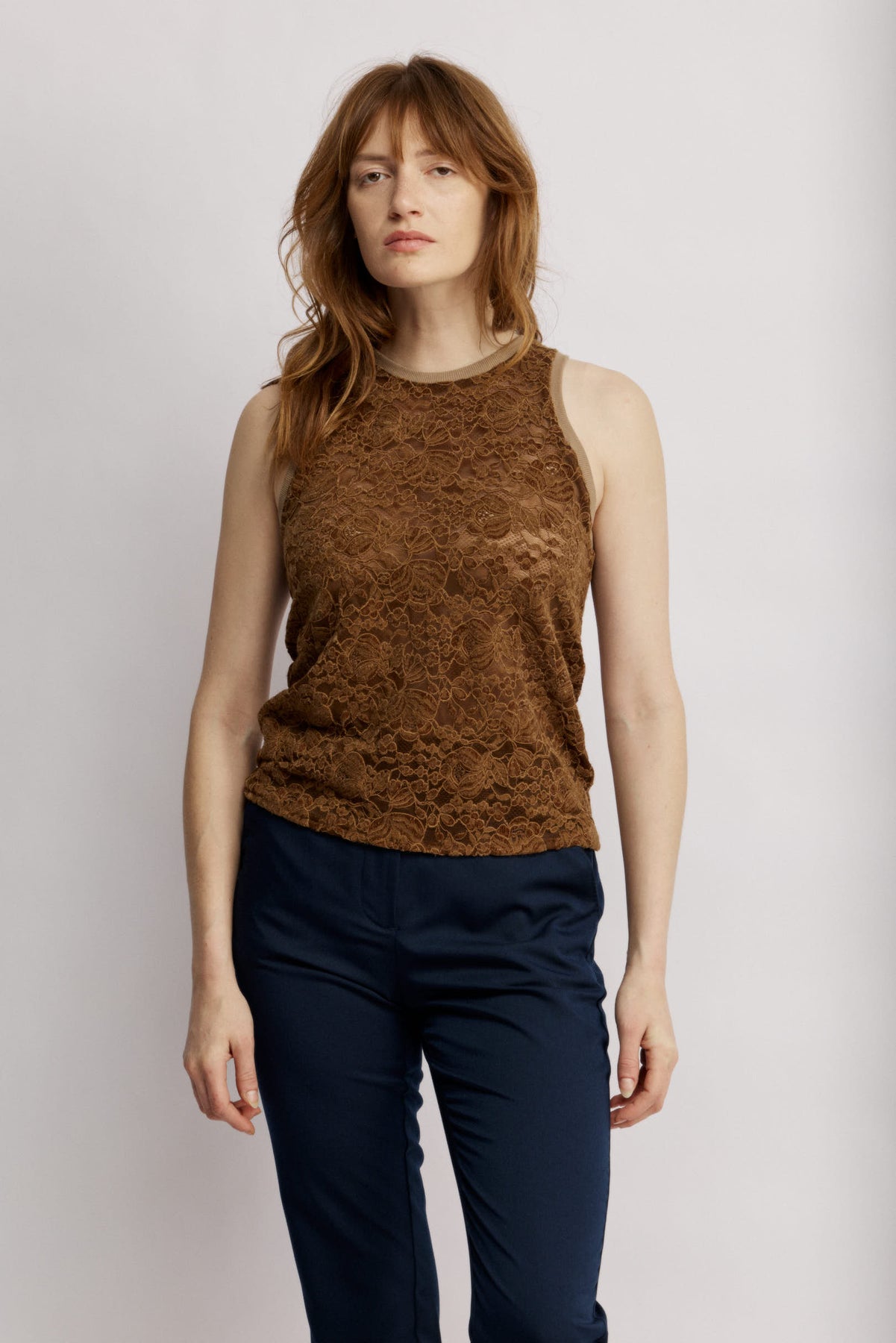 Lulu גופיה ברונזה עם מפתח עגול מבד המשלב תחרה וקטיפה משכית