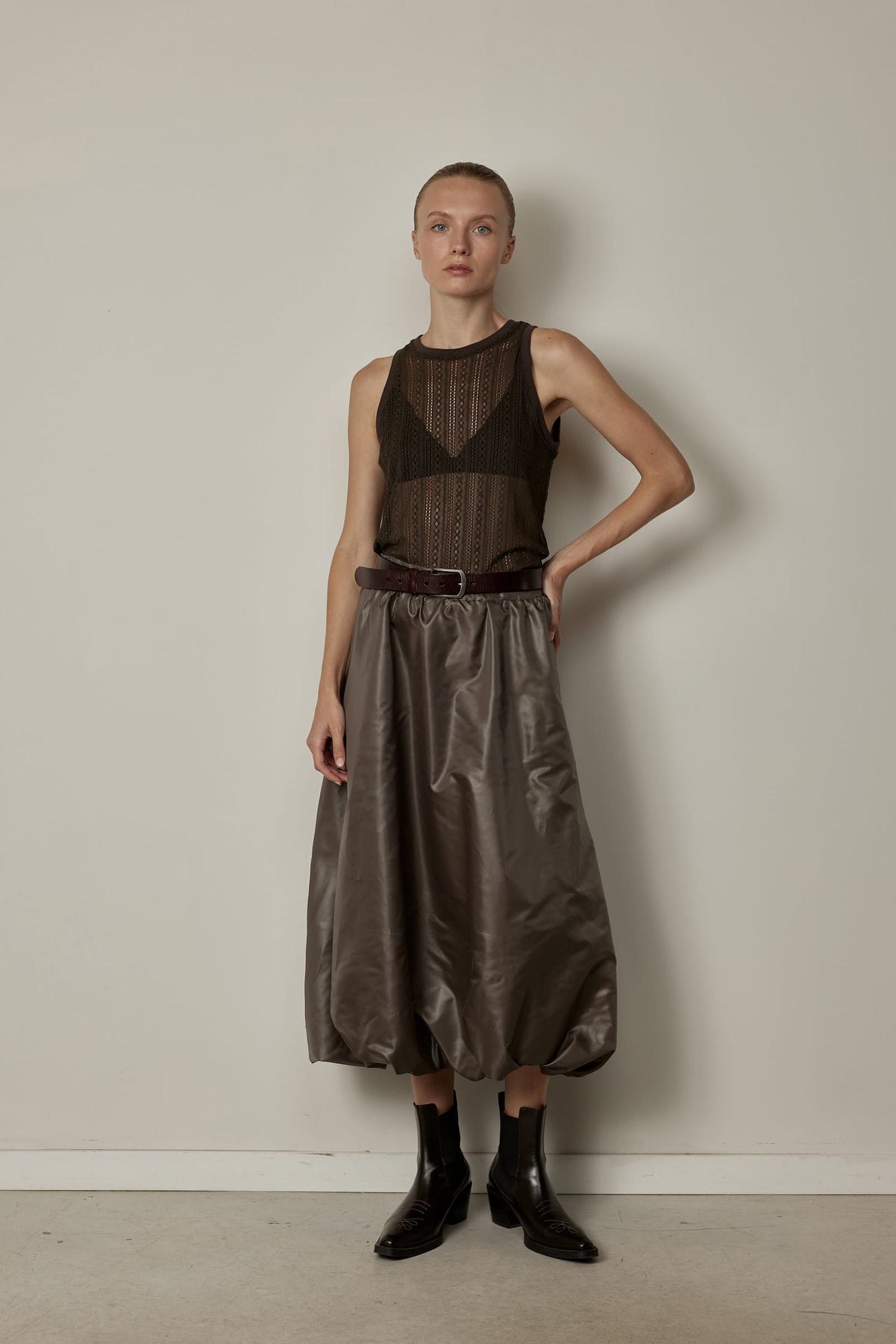 The Alexis Skirt is a midi design with soft volume and subtle gathering at the hem. Romantic with effortless flow